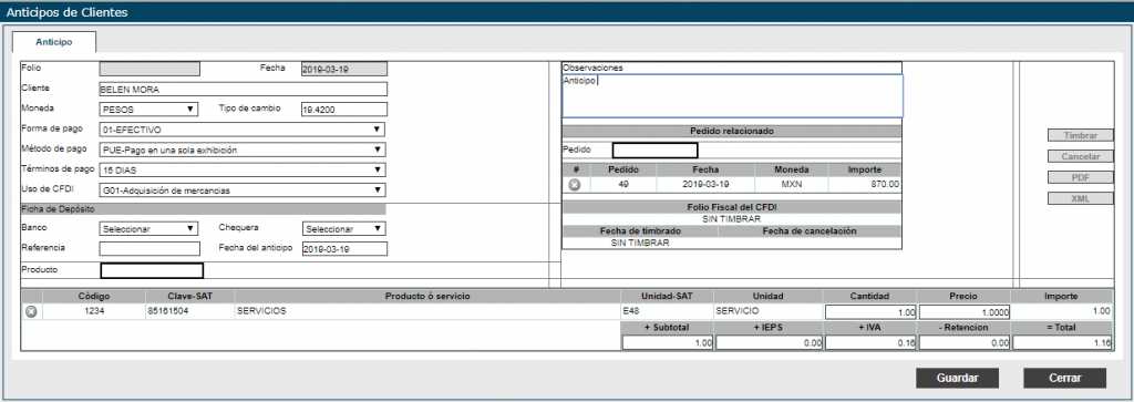 Agregue el pedido relacionado, este pedido debe de estar en el estado de FACTURACIÓN para poder relacionarlo al anticipo.