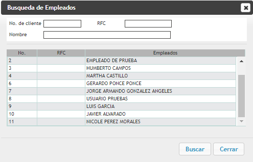 En el recuadro empleado: Ingrese el nombre del empleado a cargo (También puede ingresar la inicial del nombre de la caja y seleccionar el nombre) o haga clic en la opción Buscar. puede hacer una consulta general de los empleados dejando los campos en blanco, o ingrese el nombre o No. De empleado).