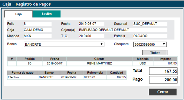 Puede imprimir el ticket nuevamente ingresando al folio de registro del pago seleccionando el botón Ticket.