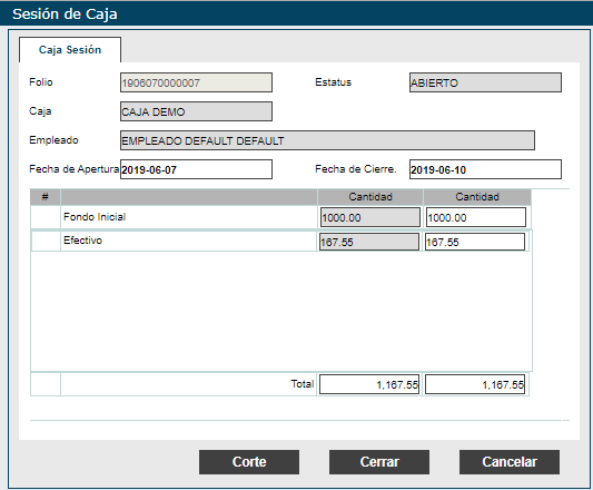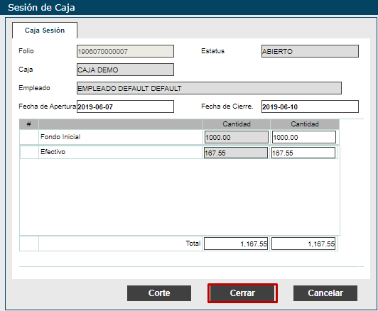 Al finalizar aparcera la fecha y hora de cierre de la caja.