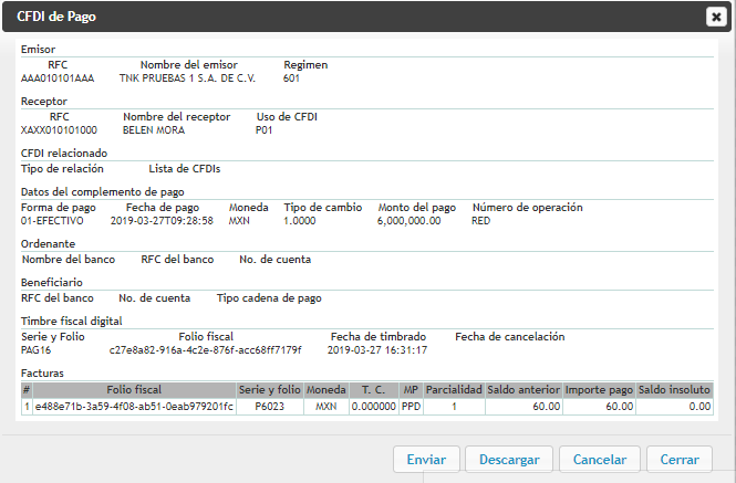 Para enviar al cliente su comprobante de pago registrado haga clic en el botón Enviar.