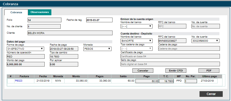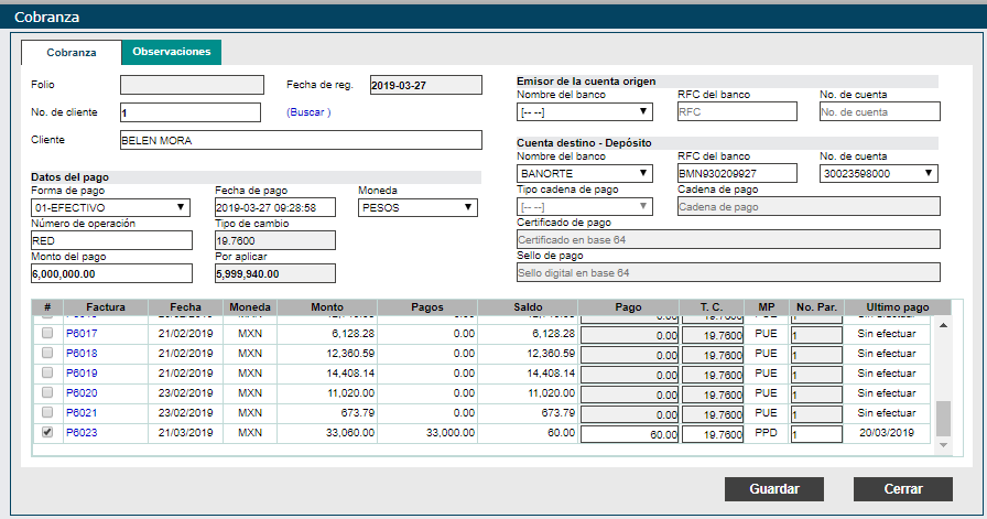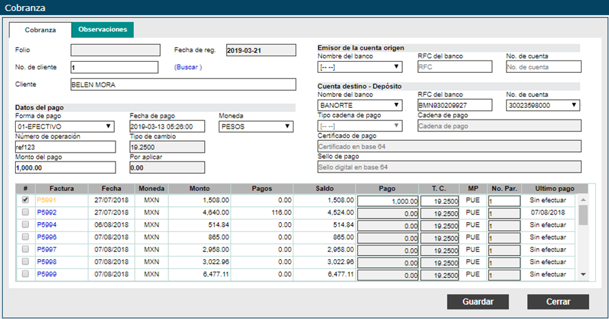 Al tener los datos correspondientes y haber seleccionado la factura, presionamos el botón de guardar.