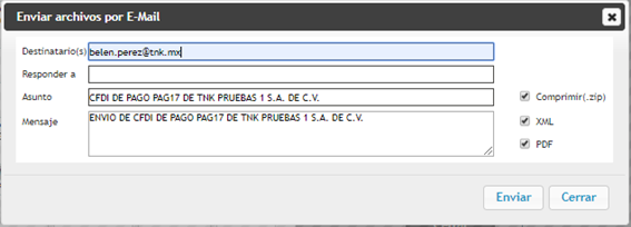 Ingrese en destinatario el correo de su cliente o la persona a la que le llegaran estos archivos, verifique que estén seleccionados las casillas de la parte derecha y presione el boton de Enviar.