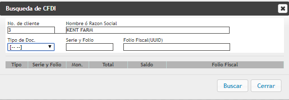- Ingrese el documento a relacionar. Seleccione el tipo de documento y haga clic en buscar para mostrar los doc. Seleccione el CFDI.