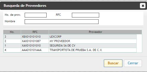 2. Ingrese el No. De proveedor. Si no conoce el número de proveedor haga clic sobre la opción Buscar. Dentro de Búsqueda de proveedores deje los campos vacíos y haga clic en buscar para mostrar todos los proveedores que están ingresados dentro del sistema. Seleccione el proveedor correspondiente a quien le pedirá los productos.