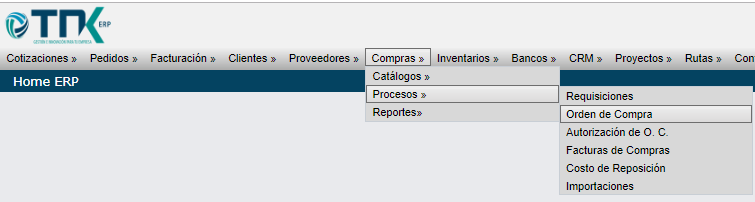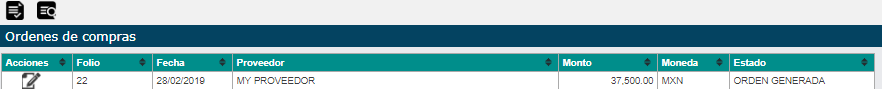 Su orden de compra se muestra en las órdenes de compra realizadas y su estatus actual es ORDEN GENERADA (este status se actualiza según los movimientos realizados sobre esta orden de compra) Después de generar la Orden de compra se tiene que Autorizar Orden de Compra.