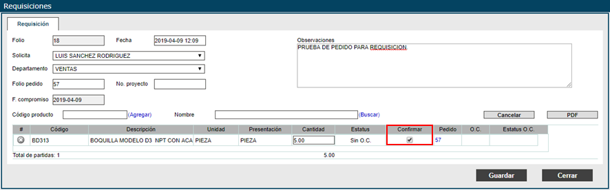 Al guardarlo cambia el estado SIN OC por lo que deberá de generar una Orden de Compra.