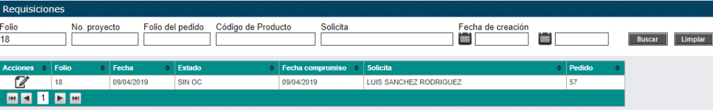 Ingrese el folio de la requisición y haga clic en Buscar. En caso de no conocer el folio de la requisición puede buscarlo por el pedido que se realizó.