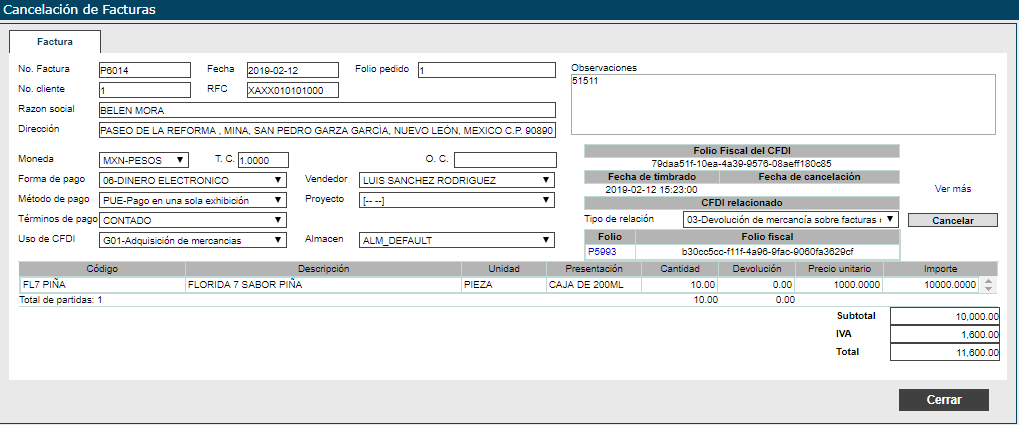 - Cancelación por Re facturación: se cancela la factura y permite volver a crear una factura nueva con el mismo pedido. Los campos no serán editables, solo la información del cliente.