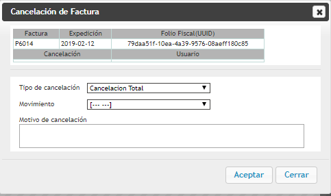 Movimiento: Es opcional, ya que en el motivo de la cancelación se puede poner el movimiento de este.