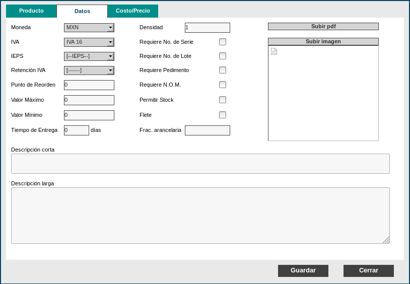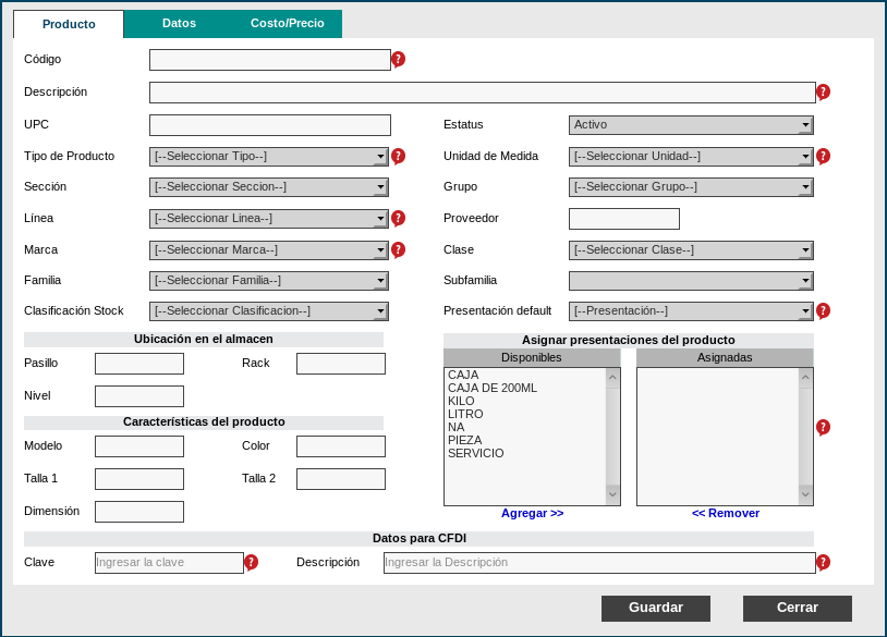 Después de seleccionar el icono de Nuevo, nos mostrará una ventana con las pestañas Producto, Datos y Costo/Precio. En cada pestaña se presenta un formulario con los campos que se deben llenar para la alta de producto.
