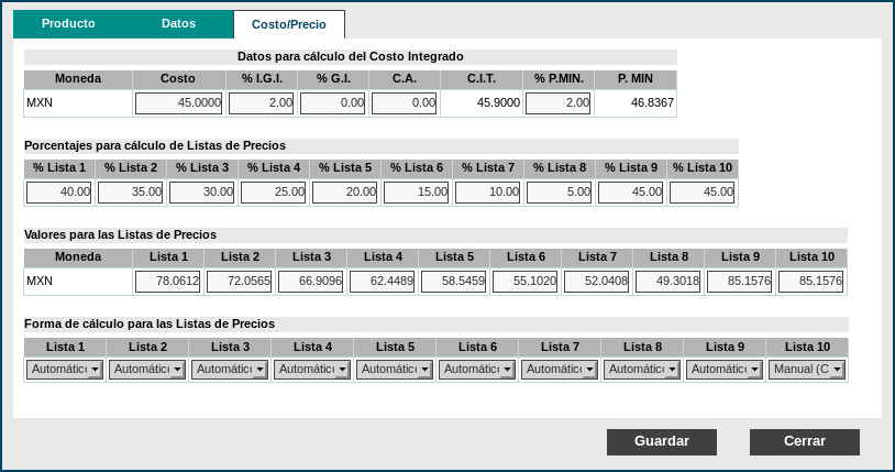 - Costo. Es el costo de reposición ó costo de ultima compra. A partir de ella se calcula el CIT, PMIN y Listas de precios.