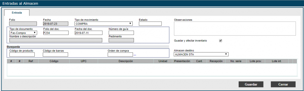 - Seleccionar Tipo de movimiento de inventario: COMPRA.