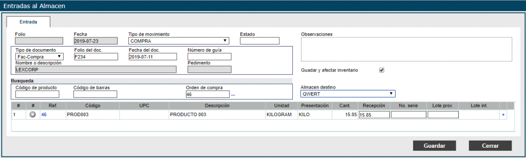 8. El siguiente paso es que el almacenista debe contar físicamente los productos que está recibiendo e ingresar en la columna Recepción. Opcionalmente puede agregar No. serie, Lote prov. si se dispone de ésta información.