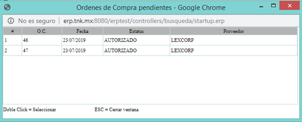 6. Ingresar el folio de la Orden de Compra generada en el sistema y pulsar enter. Se mostrará la información de los productos pendientes de darle entrada correspondientes a la orden de compra ingresada. (*Puede seleccionar ” … ” para mostrarle las ordenes de compra que ya fueron autorizadas)