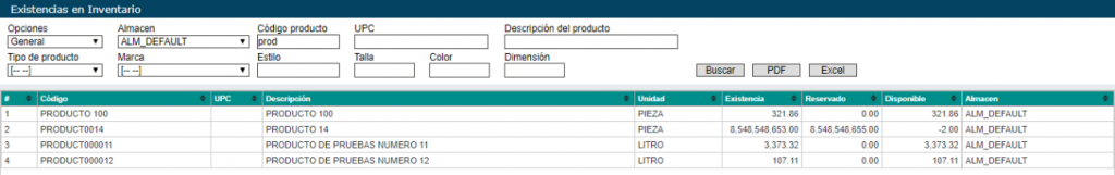 En este reporte le mostrara el código del producto, el UPC (código de barras), el tipo de unidad del producto, existencias, reservados, disponibles, y el almacén en el que se encuentran los productos.