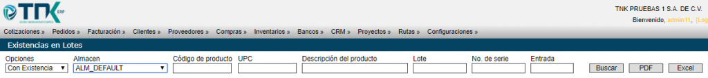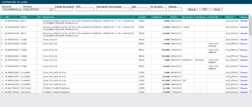 Usted podrá generar un PDF o Excel de la existencia de productos en lotes presionando el botón correspondiente.