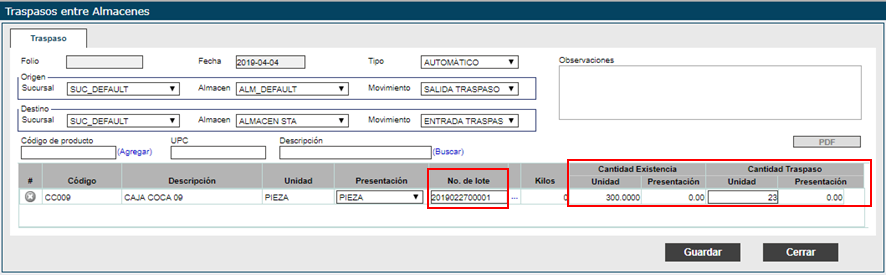 Ingrese en Cantidad traspaso la cantidad de Unidad de los productos a los cuales realizara el traspaso, la cantidad debe de ser igual o menor a la que se encuentra en existencia.