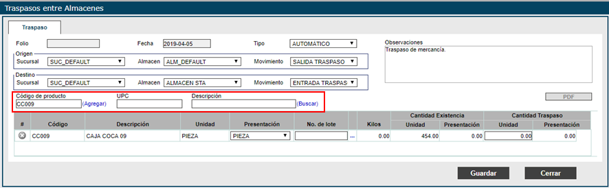 En Cantidad Existencia en el campo Unidad visualice los productos que se encuentran en el almacén, tome en cuenta que la cantidad para el Traspaso NO debe ser mayor que la existencia actual.