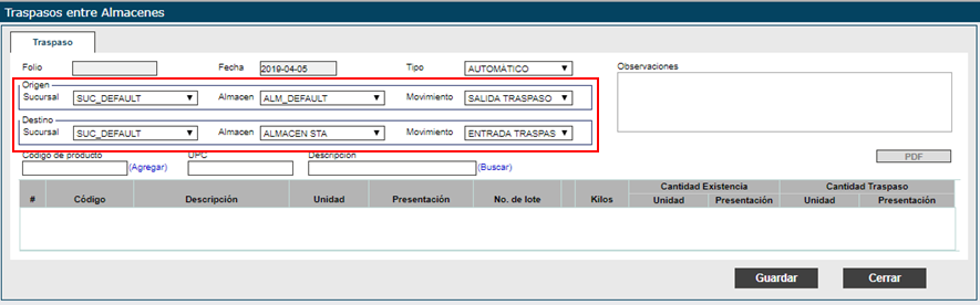 Seleccione la sucursal, el almacén y el movimiento a realizar de donde se originará el movimiento de salida de productos.