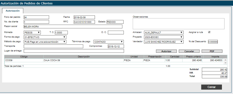 3. Seleccione el botón de Autorizar, en la parte baja de observaciones también se muestra la opción de cancelar el pedido y descargar el PDF de dicho documento.
