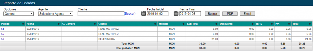 En este Reporte De Pedidos usted podrá visualizar los pedidos creados, y obtener un total del precio sobre los pedidos los cuales podrá filtrar por Opciones del estado del pedido, Agente, Nombre del Cliente, y fechas límites (De Fecha Inicial a Fecha Final).