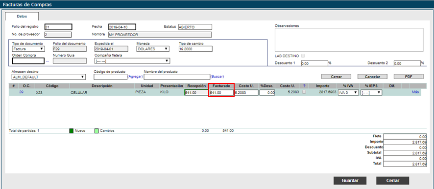 Ingrese la cantidad a Facturar, aquí se factura la misma cantidad de la recepción.
