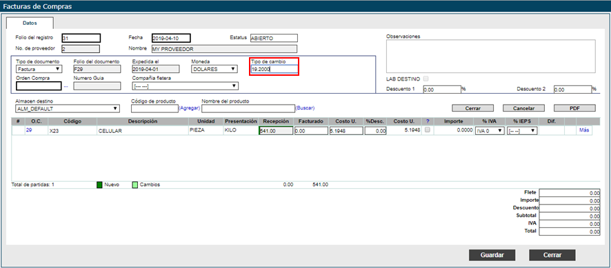 Al entrar a la factura de compra le pedirá que ingrese el Tipo de cambio.
